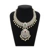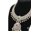 Make a statement with this exquisite Grand Diamond Finish Necklace, a masterpiece that combines intricate traditional design with premium materials. The necklace features a prominent detachable pendant design, heavily studded with sparkling CZ stones that offer brilliance comparable to real diamonds. The center is highlighted by striking semi-precious ruby and emerald stones, adding a vibrant pop of color, while delicate pearl drops complete the regal look.