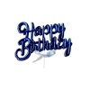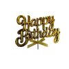 A non-edible cake decoration made of durable plastic or acrylic with a vibrant, metallic or glittery “Happy Birthday” script design. It is typically mounted on a clear stick for insertion into a cake and features a small, decorative silver or white ribbon bow accent.