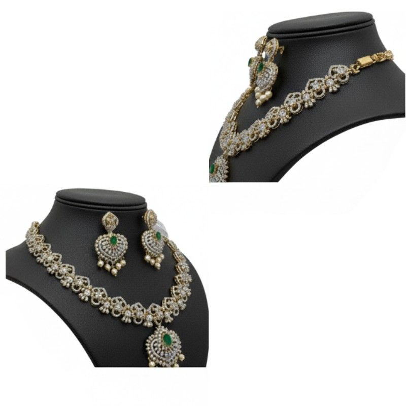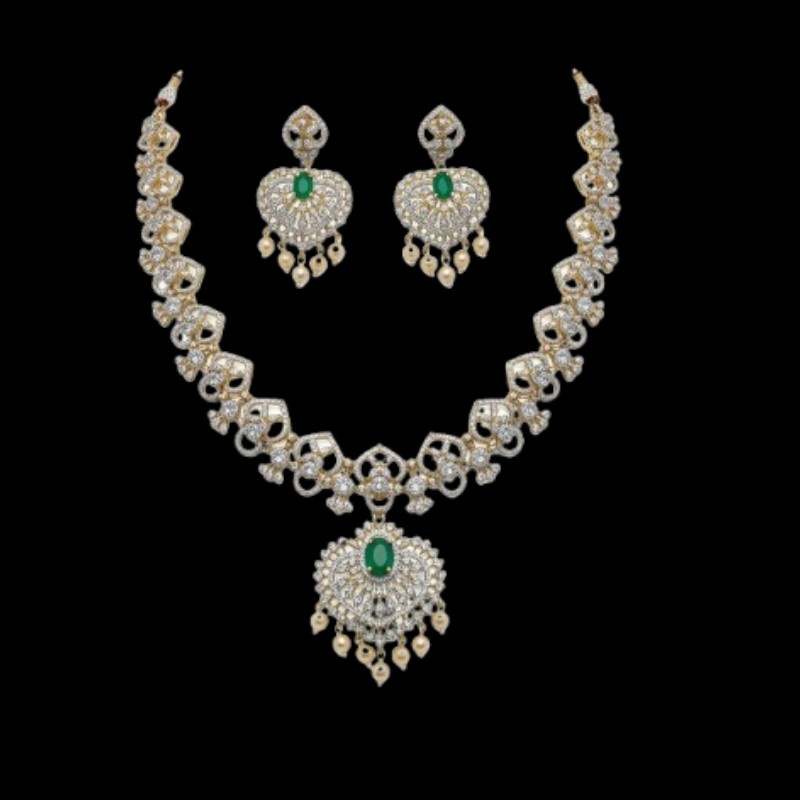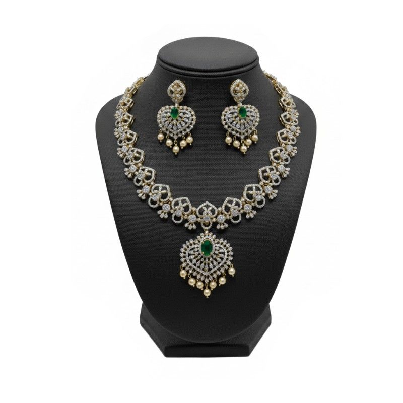 Discover stunning versatility with this premium jewelry ensemble. Crafted from hallmarked 925 sterling silver and coated in rich 22ct gold plating, this set offers a luxurious ‘diamond finish’ look. The design features sparkling cubic zirconia stones and vibrant semi-precious emerald accents, as seen in the image. A key feature is the large, intricate pendant which is fully detachable, allowing the wearer to style the necklace as a heavy collar piece or with the pendant attached for a statement look. The matching earrings are secured with traditional screw-style backs. This piece blends high quality materials with functional elegance, perfect for bridal wear or grand occasions.