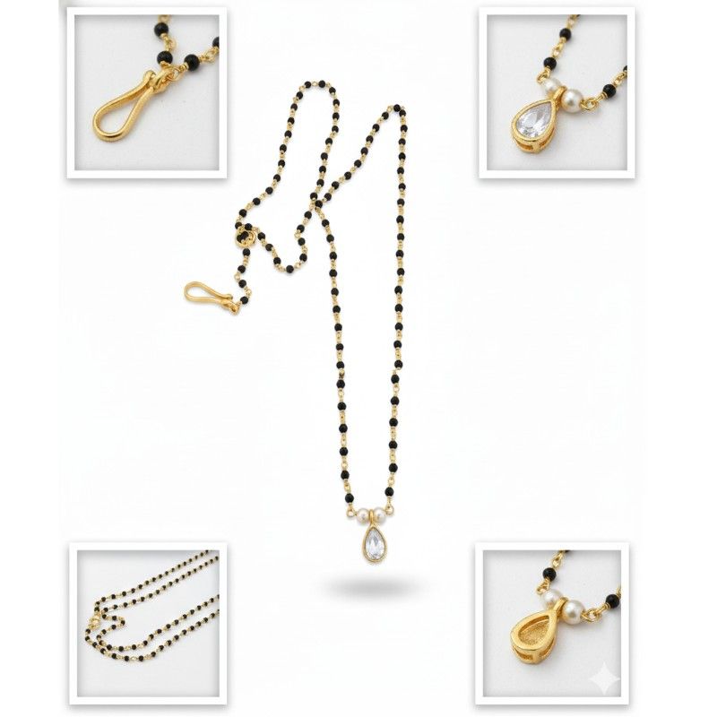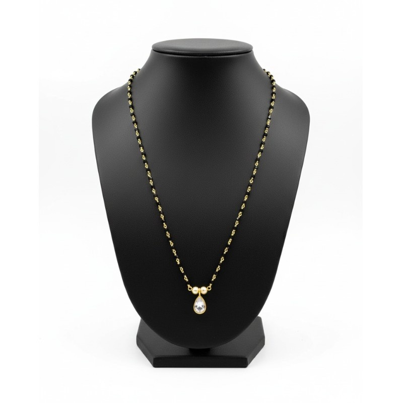 - Pendant: The focal point is a simple yet elegant teardrop-shaped pendant featuring a sparkling clear stone (likely high-grade CZ or kundan style) set in a gold frame.