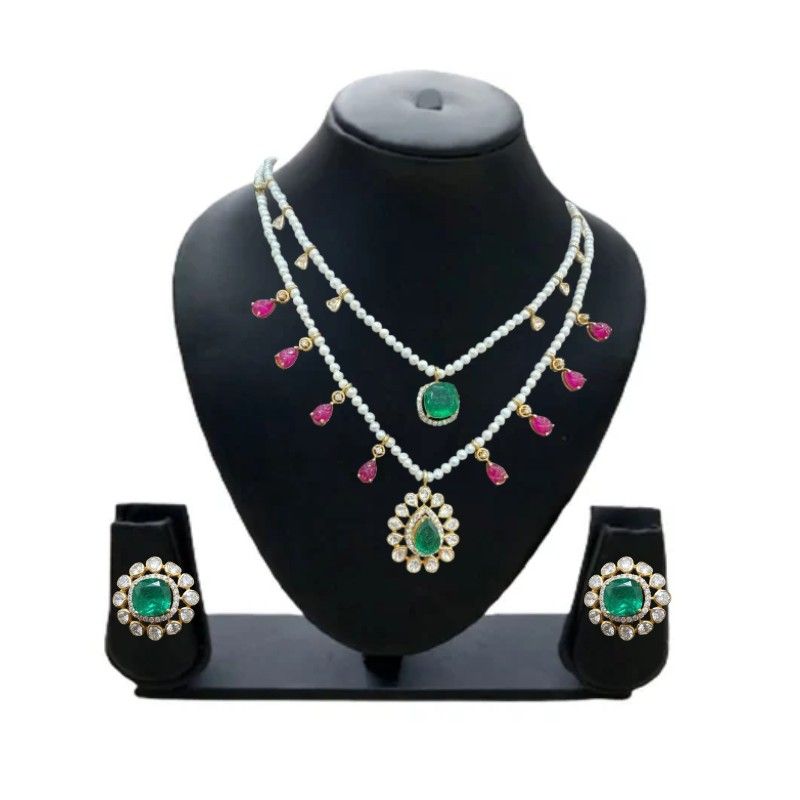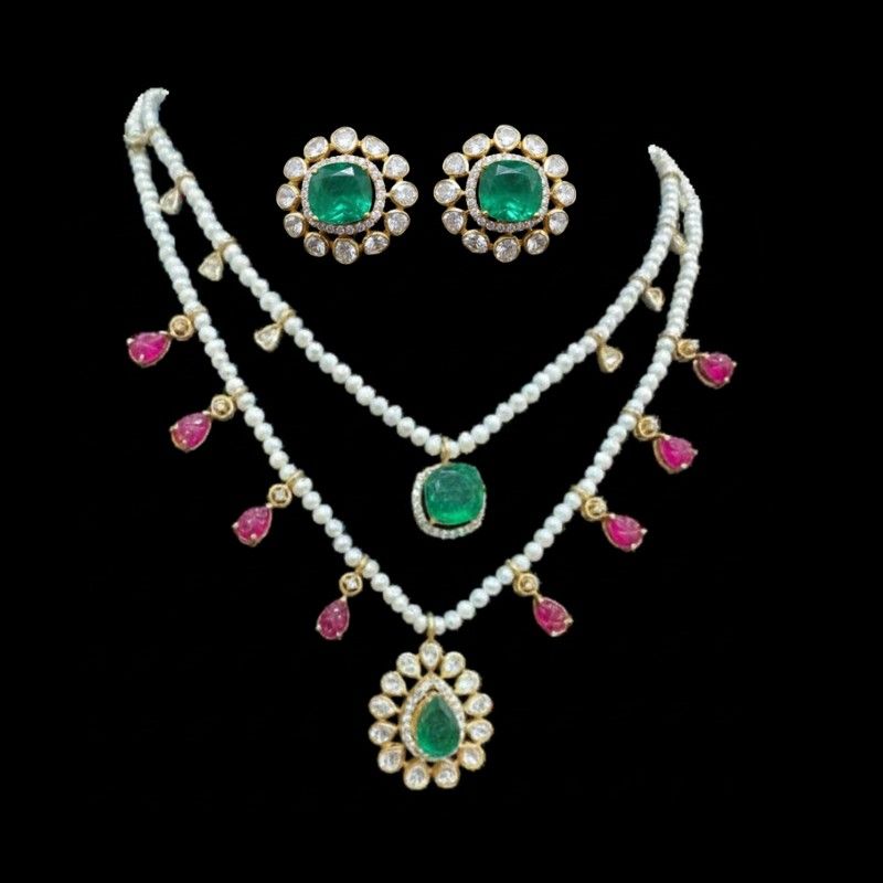 Discover timeless elegance with this stunning two-layered necklace set. The necklace is strung with lustrous real pearls and features intricate detailing with brilliant moissanite stones, all set in high-quality 925 sterling silver with a luxurious 22-carat gold plating. The set includes matching screw-style moissanite earrings, ensuring a secure and comfortable fit. This opulent jewelry set is perfect for bridal wear, formal events, or any occasion where you want to make a sophisticated statement. A true blend of classic design and modern craftsmanship.
