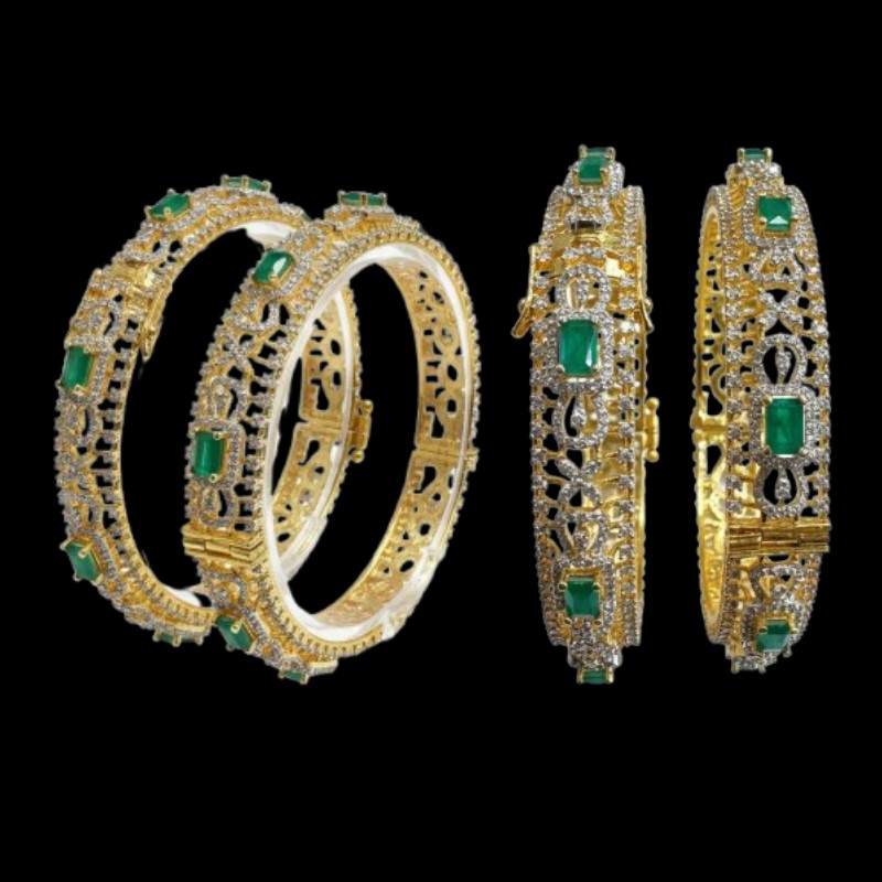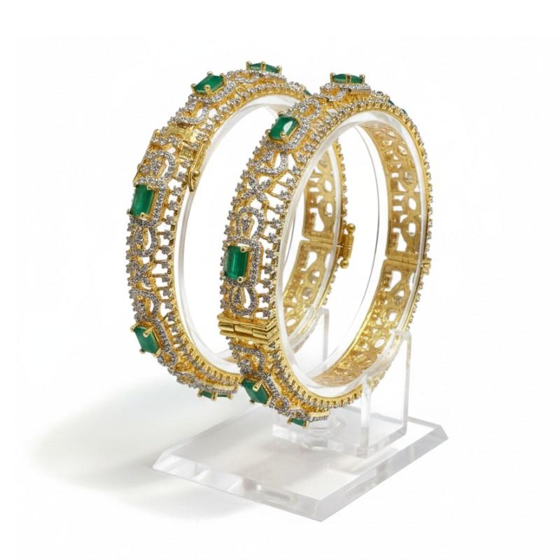 Discover stunning versatility with this premium jewelry ensemble. Crafted from hallmarked 925 sterling silver and coated in rich 22ct gold plating, this pair of open-style bangles offers a luxurious ‘diamond finish’ look. The design features sparkling cubic zirconia stones set in intricate filigree work and vibrant semi-precious square-cut emerald accents. These bangles feature a secure, hinged opening mechanism for easy wear and comfort. This piece blends high-quality materials with functional elegance, perfect for bridal wear or grand occasions.