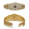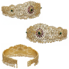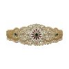 A stunning, traditional adult Vaddanam (hip belt) crafted from 925 sterling silver with a luxurious 22-carat gold plating. This piece features intricate lattice work embellished with brilliant Cubic Zirconia (CZ) and poya (polki style) stones, accented with semi-precious green stones and central ruby-red stones. The belt is finished with delicate real pearl and silver gold-plated bead drops.