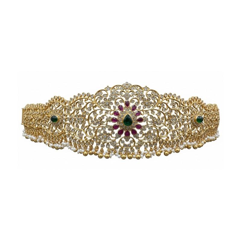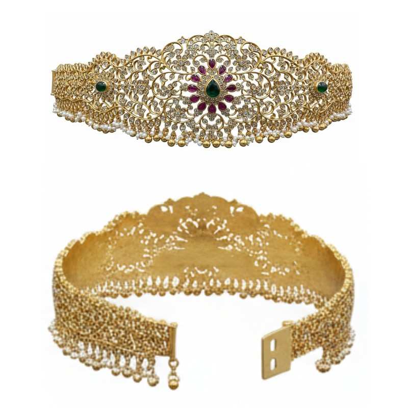 - Stones: The intricate mesh design is studded with shimmering Cubic Zirconia (CZ) stones and poya (uncut style) stones. It is beautifully highlighted by vibrant green accent stones on the sides and deep ruby-red stones in the center floral motif.