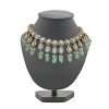 Indulge in regal elegance with this handcrafted Victorian-style short necklace set. The base is hallmarked 925 sterling silver, lavishly finished with 22-carat gold plating. The intricate design showcases a dazzling array of diamond-finish cubic zirconia and high-quality moissanite stones. The piece is accented with delicate pearl drops and vibrant real emerald beads, adding a touch of classic charm. The accompanying earrings feature secure, traditional screw-style backs for comfort and peace of mind. This exquisite set is perfect for bridal wear or any grand occasion, blending vintage aesthetics with premium materials.