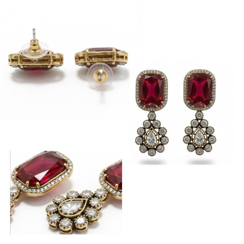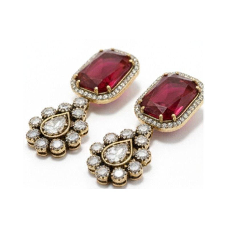 - Cubic Zirconia (CZ): Smaller CZ stones create a halo effect around the rubies and decorate the floral cluster drop.