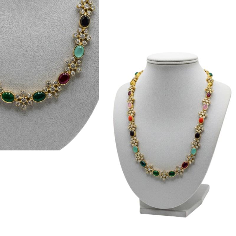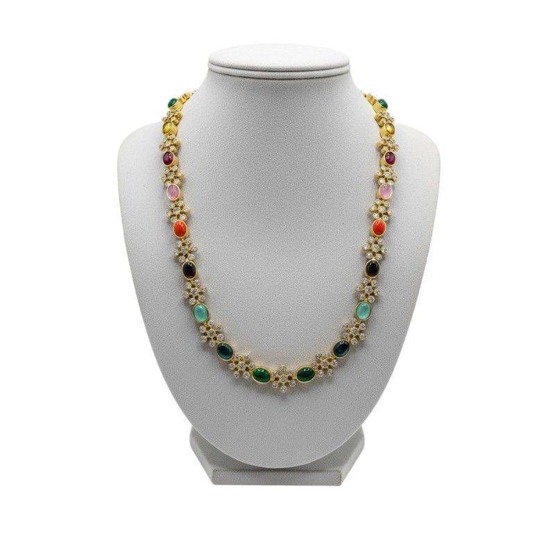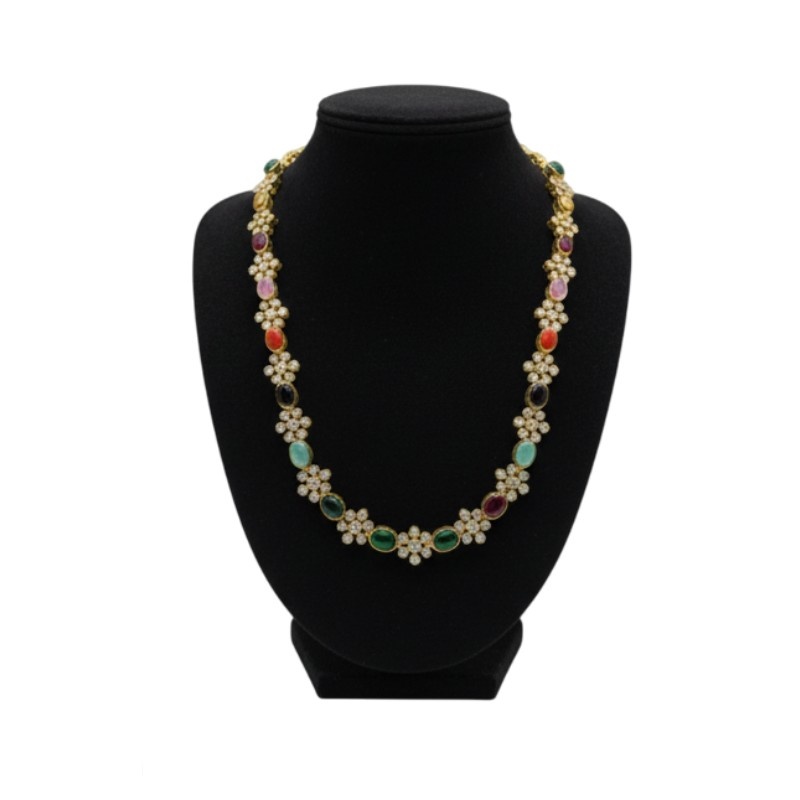 - Navratna Gemstones: Features nine genuine-looking, multi-colored cabochon stones—each representing a celestial body—set in intricate floral motifs accented with sparkling white stones.