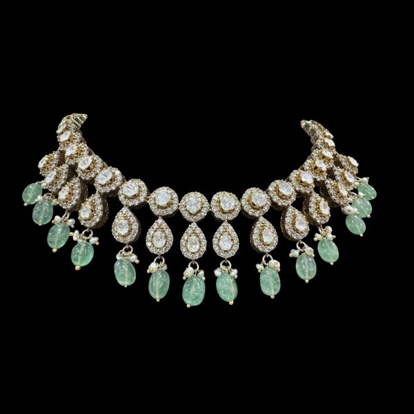 An opulent and regal traditional Indian necklace, handcrafted in an antique gold finish and studded with brilliant cubic zirconia stones, moissanite stones, delicate pearls and real emerald beads necklace and screw style earrings. The choker design features intricately framed segments of clear, uncut stones and a series of large, smooth, emerald green drops cascading from the base, accentuated with delicate pearls. This piece perfectly balances rustic, old-world charm with elegant sophistication.