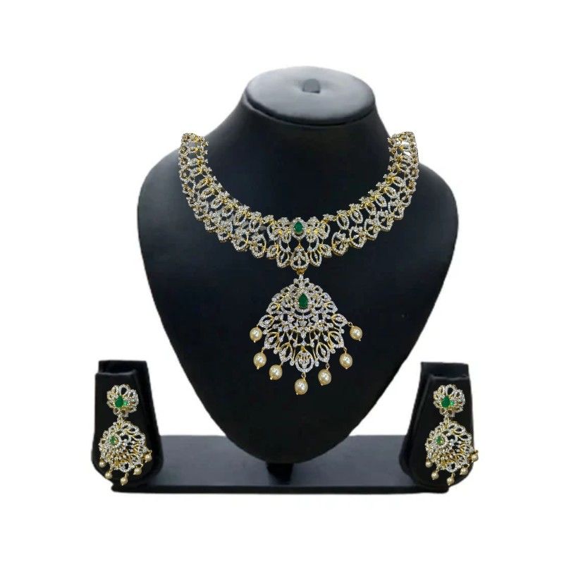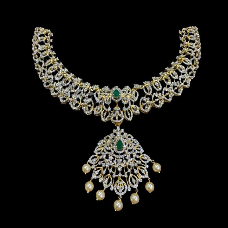 Elevate your elegance with this stunning American diamond (CZ) necklace set. Featuring a brilliant diamond finish, the intricate floral and teardrop design is centered with vibrant emerald green cubic zirconia (CZ) stones and adorned with lustrous pearl drops. This set includes a matching pair of dangling earrings, perfect for adding a touch of sophistication and sparkle to any special occasion.