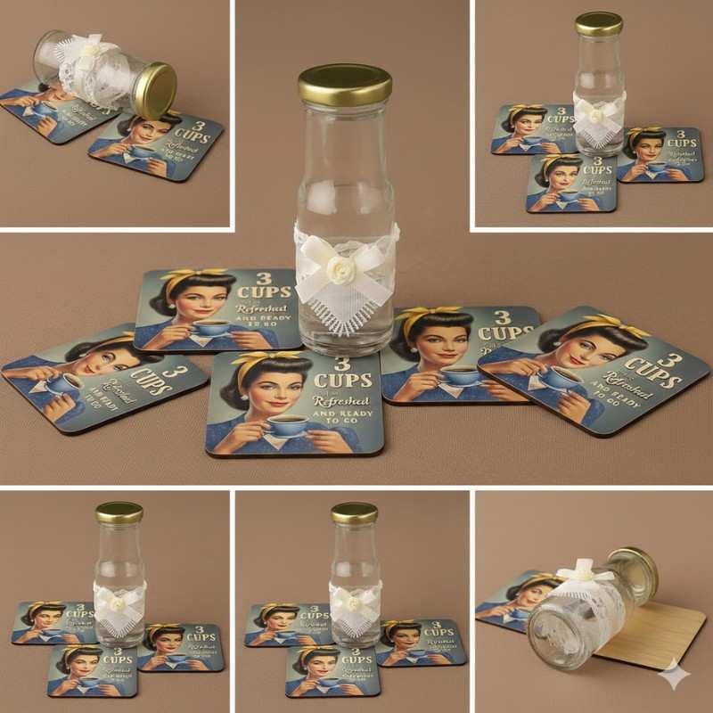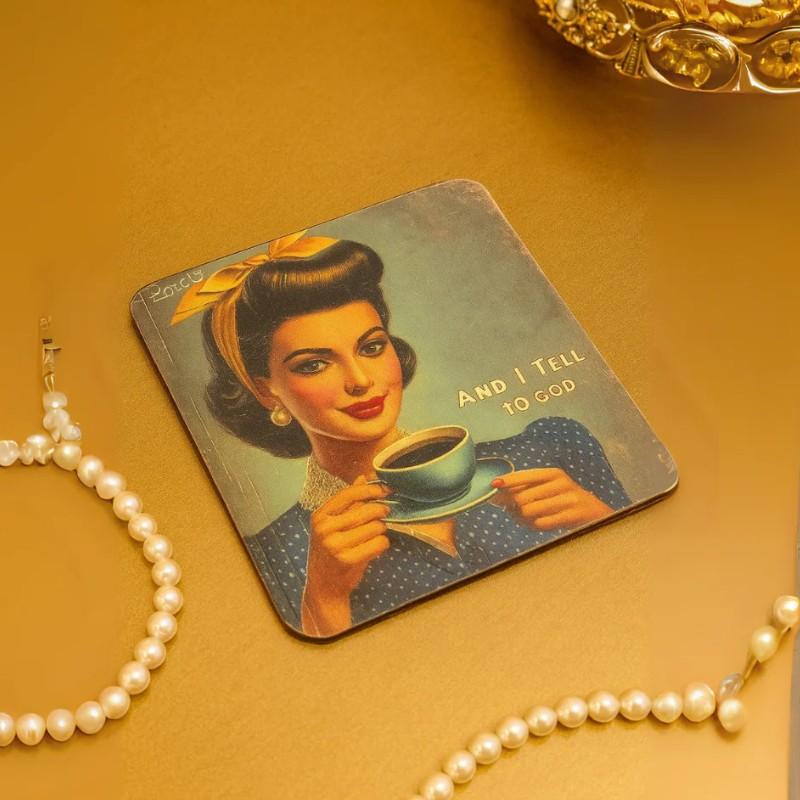 - Design: Humorous vintage pin-up girl illustrations with funny coffee quotes.