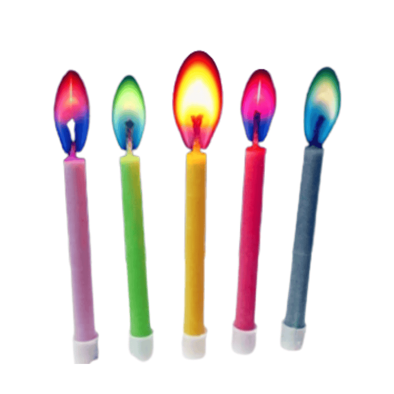 Give a birthday cake a special touch with these unique candles that burn with vibrant colored flames. The flames are the same color as the candle itself. Each pack typically includes 6 to 12 candles with plastic holders to prevent wax from dripping onto the cake.