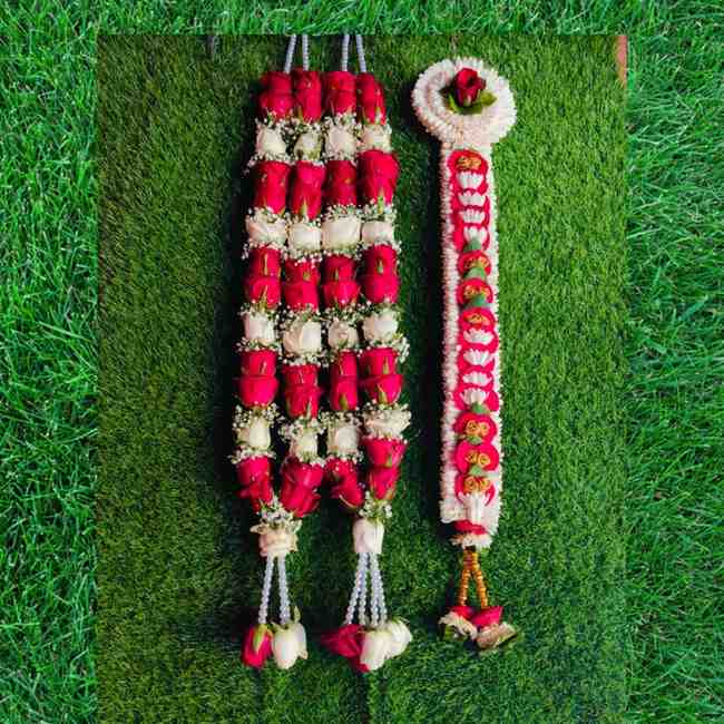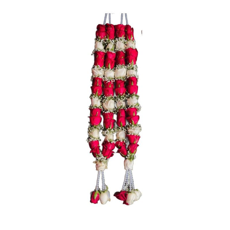 This exquisite varmala is meticulously handcrafted, combining the timeless beauty of red roses with the delicate fragrance and elegance of white Rajnigandha (tuberose). Ideal for traditional Indian weddings, engagements, and other auspicious ceremonies, it symbolizes love, purity, and new beginnings. The garland’s intricate design and fresh floral appeal make it a stunning accessory for the bride and groom or for deity adornment during pujas and festivals.