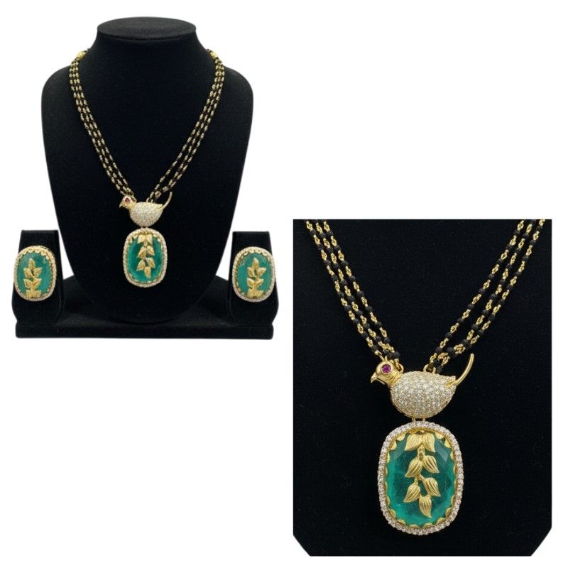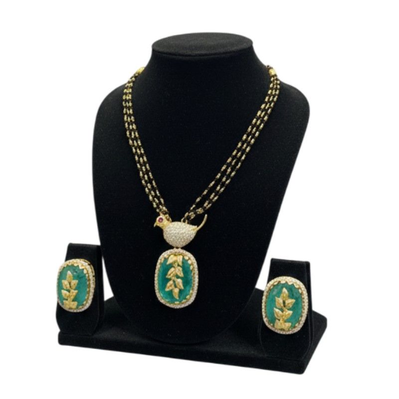 Elevate your style with this exquisite Emerald Green Carved Moissanite Pendant and Earring Set. Designed for elegance, the oval-shaped emerald-green synthetic stones feature intricate leaf carvings, set in high-quality 925 sterling silver with a rich 22-carat gold plating. The pendant is adorned with a delicate gold bird accent, featuring pavé-set moissanite diamonds for exceptional brilliance. The necklace is a stylish three-layered chain of black crystal beads, offering a sophisticated contrast. The accompanying stud earrings mirror the pendant’s design, making this a complete look for special occasions or a glamorous everyday statement.