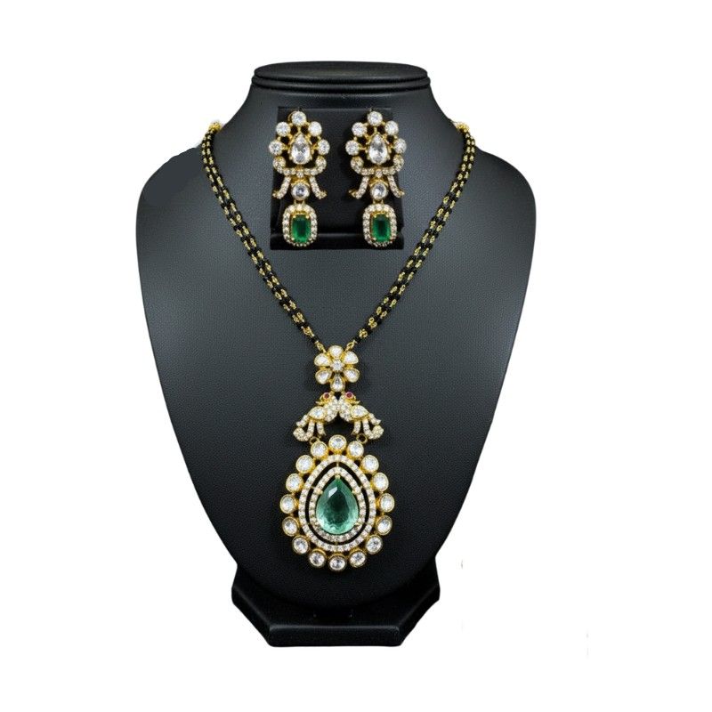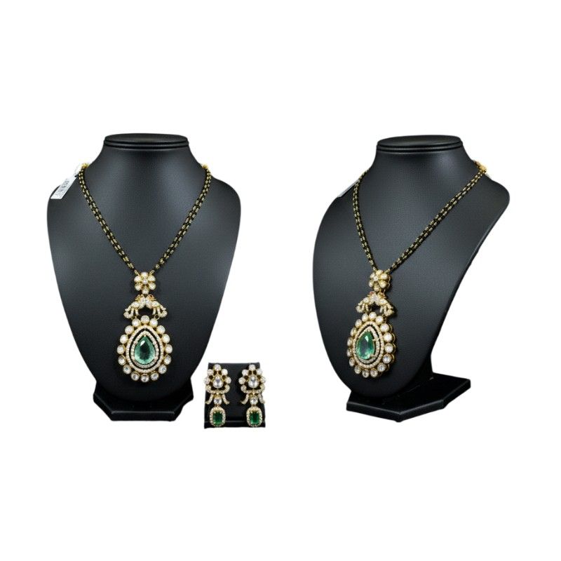 925 Silver 22k Gold Plated Emerald Green Teardrop Moissanite Pendant Black Beads & Earring Set
