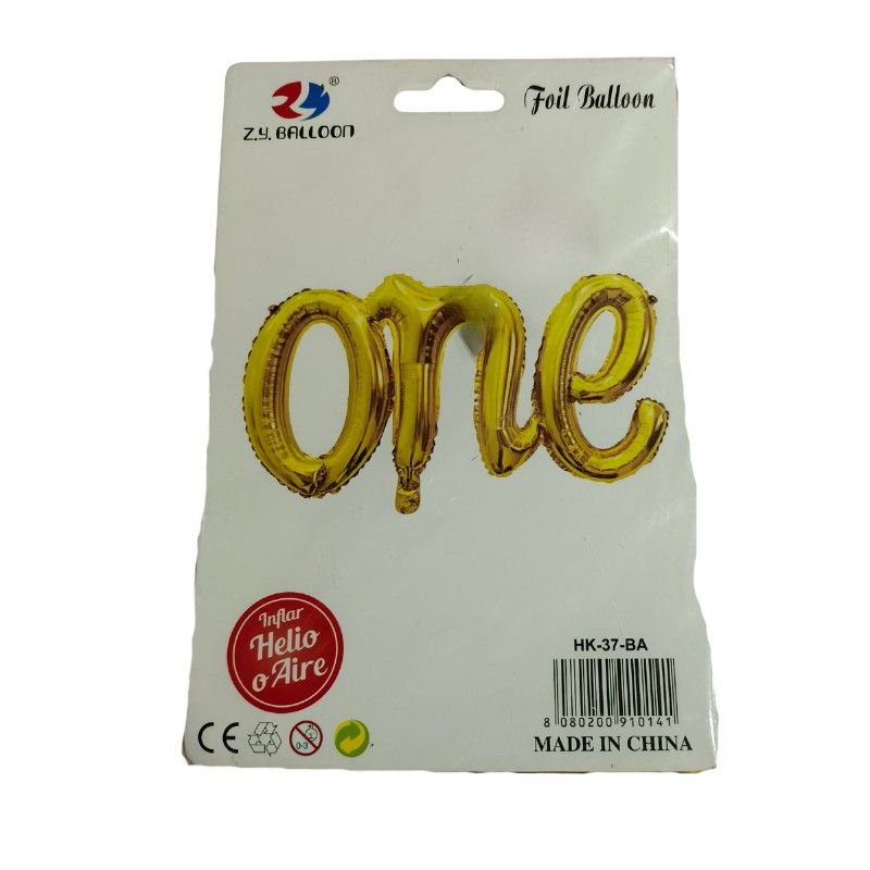 This gold “one” script foil balloon is a large, self-sealing decoration made from a durable, shiny aluminum mylar foil material. It is a single-piece balloon with the word “one” in a handwritten or cursive style. The balloon can be inflated with air using a straw or hand pump, or with helium for it to float. Its reusable design allows it to be deflated and stored for future use. The balloon is an ideal party centerpiece or backdrop for photo shoots to celebrate a first birthday or other similar occasion.