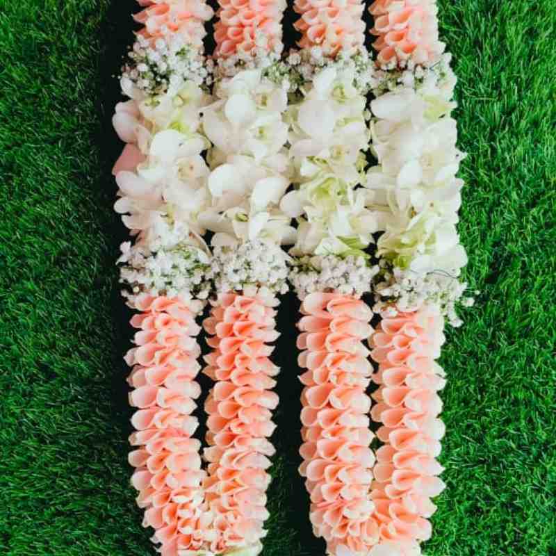 Perfect for bride and groom varmala exchange, engagements, anniversaries, housewarming ceremonies, and religious poojas, this garland symbolizes purity, love, and celebration. Its elegant design ensures it stands out in photographs, making your event memorable. This beautifully handcrafted garland (jaimala) is designed to add grace and tradition to your special moments. Made with fresh/artificial flowers, it features a vibrant combination of pink petals, white buds, and green leaves, giving it a rich and festive look.