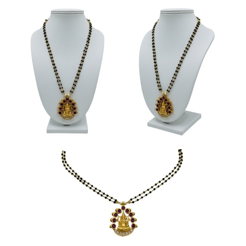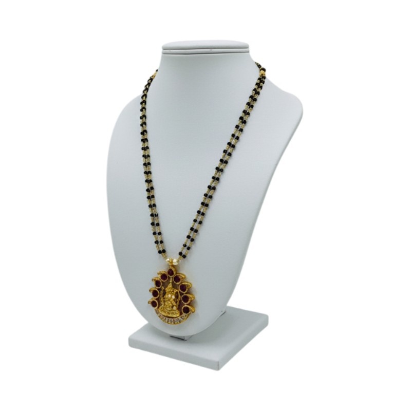 Embrace tradition with this exquisite Lord Ganesha Pendant Set. Designed with divine elegance, the pendant features a detailed carving of Lord Ganesha, the remover of obstacles and god of wisdom, surrounded by a halo of vibrant red/ruby-colored stones and a single small pearl drop. All components are set in high-quality 925 sterling silver with a rich 22-carat gold plating. The necklace is a delicate single-layered chain of black crystal beads, offering a classic contrast and comfortable fit. This piece is perfect for festive occasions, daily traditional wear, or as a thoughtful religious gift, symbolizing good fortune and protection.