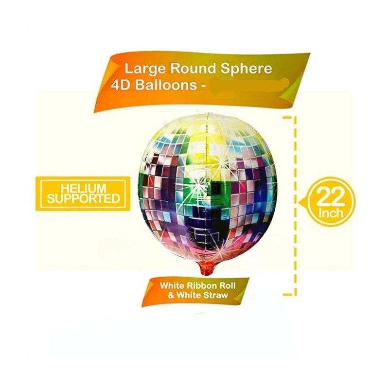 Elevate any event with this stunning 22-inch multicolor 4D disco ball foil balloon. Its spherical 4D design provides a realistic, shimmering mirror-like effect that displays multiple bright colors and angles, making it a spectacular visual centerpiece or photo prop. Crafted from high-quality, non-toxic, and durable aluminum material, the balloon is built to last throughout your celebration. It features a self-sealing valve for easy inflation with air or helium (helium allows it to float) and can be deflated with a straw for storage and reuse. Ideal for 70s-themed parties, birthdays, weddings, dance parties, and New Year’s Eve celebrations.