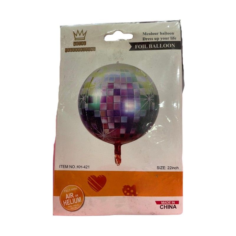 This large, 22-inch diameter foil balloon features a unique 4D design that reflects light like a traditional disco mirror ball, offering a vibrant, multi-angled shine. Made from durable aluminum foil (Mylar), it is self-sealing, reusable, and can be filled with either air or helium. It is perfect for various parties and events. Shop for the 22-inch Multicolor 4D Disco Ball Foil Balloon. Features a unique mirror metallic finish, self-sealing, and can be used with air or helium. Perfect for disco, birthday, or dance party decorations.