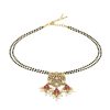 A luxurious jewelry set featuring a traditional ruby-red kundan pendant with pearl drops on a two-layered black crystal bead chain. The set is crafted from 925 sterling silver and plated with 22-carat gold, accentuated with sparkling moissanite stones for a brilliant finish.