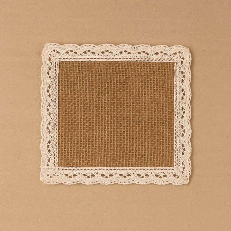 - 6 Premium Burlap Coasters: Soft-toned, square-shaped coasters made from durable burlap fabric, finished with delicate white crochet lace borders to safeguard your surfaces.