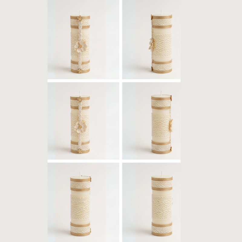 Add a touch of vintage charm to your décor with our Rustic Bloom Lace Candle. This handcrafted pillar candle is wrapped in delicate crochet lace, adorned with jute twine and floral accents, creating a perfect blend of rustic and elegant aesthetics. Ideal for festive tablescapes, romantic dinners, or as a thoughtful gift, it brings warmth and style to any setting.