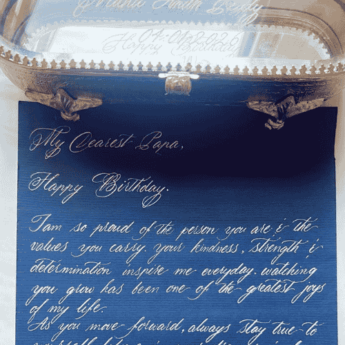 Celebrate your most meaningful moments with our Signature French Glass Memory Box – a timeless keepsake designed for heartfelt expressions. This elegant vintage-style French glass box comes with custom engraving on the lid and a beautifully handwritten calligraphy letter placed inside on premium textured A4 paper. Whether it is a birthday, anniversary, proposal, wedding message, or a special surprise, this box transforms your words into a luxury keepsake that can be cherished forever.