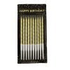 Elevate your birthday cake with these premium, long-lasting gold spiral candles. The pack includes 10 metallic candles, each with a white plastic holder for easy and secure placement. Made from high-quality wax, they burn evenly and create a festive and sophisticated ambiance for any party or special occasion.