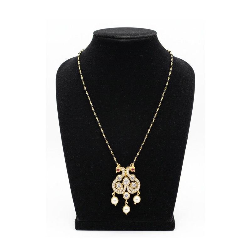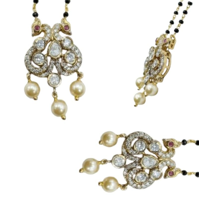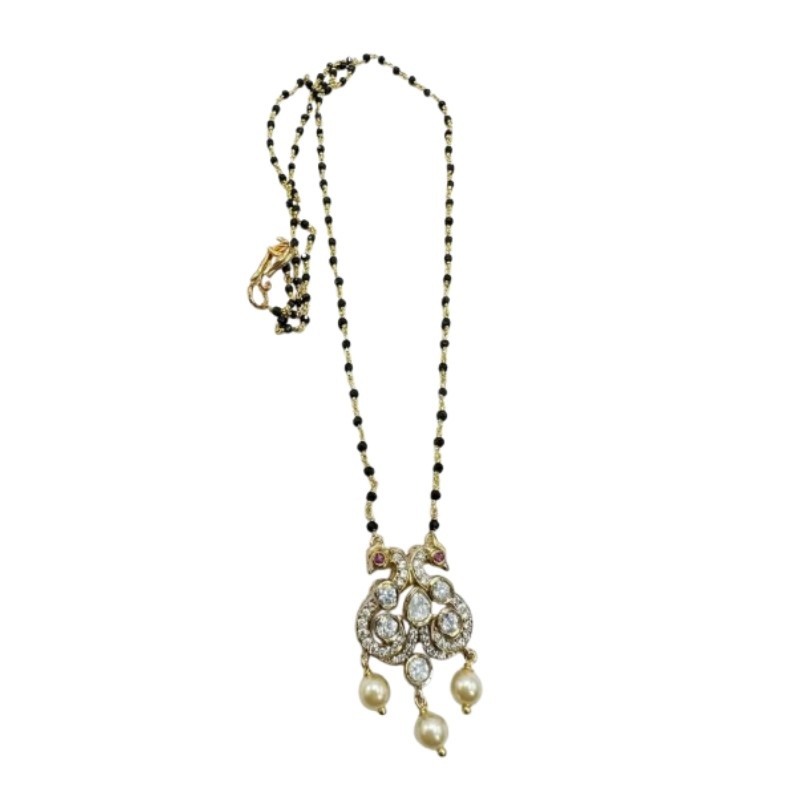 Indulge in timeless elegance with this exquisite Victorian-Style 22K Gold Plated Mangalsutra. This unique piece seamlessly blends traditional Indian symbolism with vintage charm. The intricate dual-peacock motif pendant is the star of the show, heavily studded with brilliant-cut moissanite stones that offer a mesmerizing sparkle. The design is completed with subtle red stone eye accents and graceful pearl drops that sway gently.
