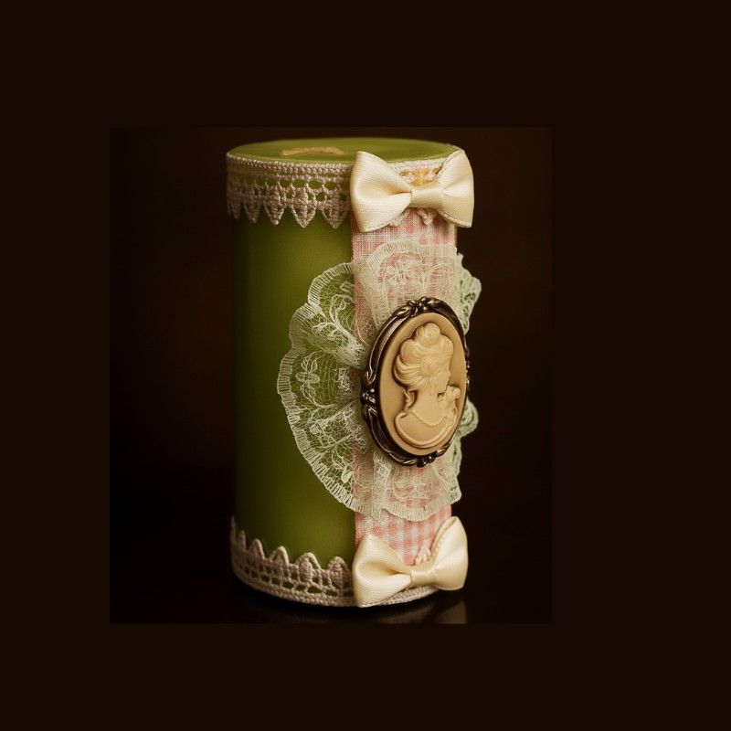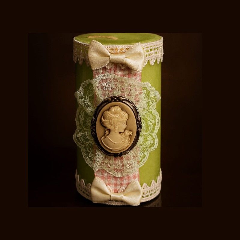 Elevate your space with timeless elegance. The Regal Cameo Vintage Lace Candle is a handcrafted pillar candle wrapped in delicate ivory lace, pastel gingham ribbon, and adorned with a satin bow and antique-style cameo brooch. The soft green wax and ornate detailing evoke classic Victorian charm, making it a luxurious centerpiece or an unforgettable gift. Unscented for versatility, this decorative candle is a tribute to refinement and craftsmanship.