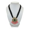 An ornate Victorian-style emerald green pendant on a multi-layered black crystal bead chain. The set features sparkling moissanite stones, crafted from 925 sterling silver and plated with 22-carat gold, finished with playful pink tassels for a unique look.