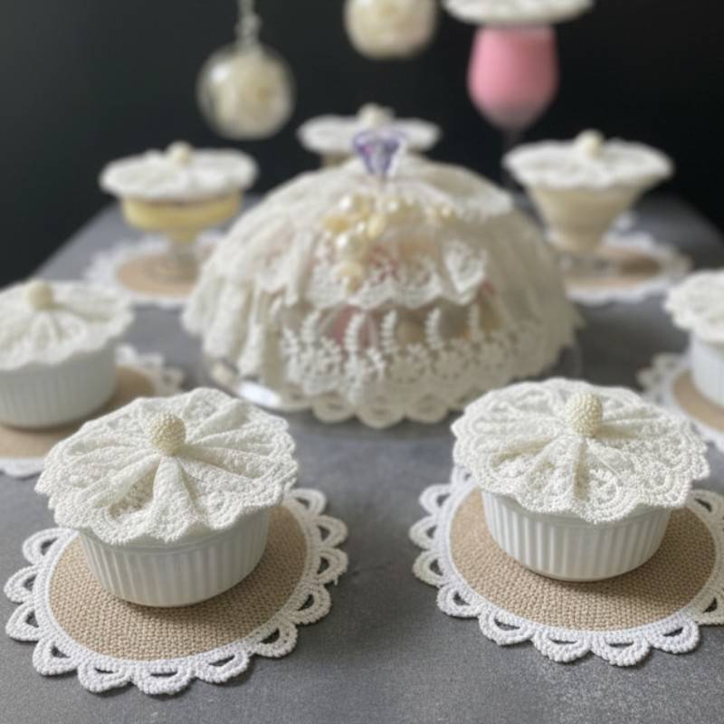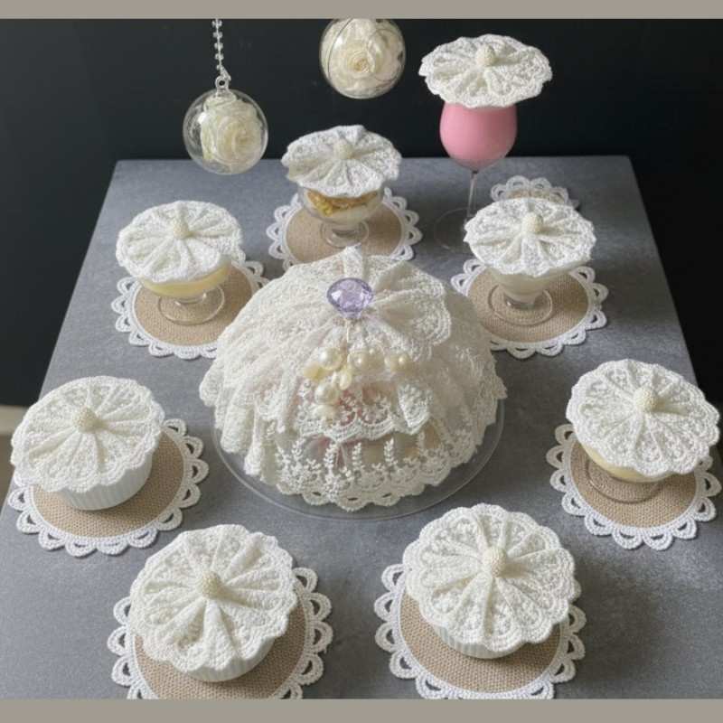 - Design: Classic bell shape with delicate lace trim and a decorative top handle for easy lifting.